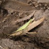 泳いでいたカエルが稲につかまっています。ここ数日、カエルにとっての天敵である蛇が頻繁に畔で見られます。居心地は良くないでしょうが、稲の方が安全なのかも知れません。カエルと稲と、同じような色になっています。